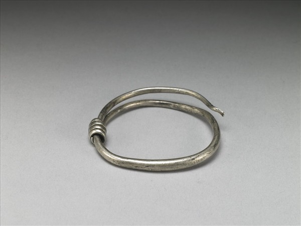 銀銅合金手鐲,整器由兩端較細的金屬條製作而成,中段略凸,外壁光素無紋。金屬條拗彎為圓,一端分別反折旋繞於器身,可作為配戴時固定、調整環徑之用。