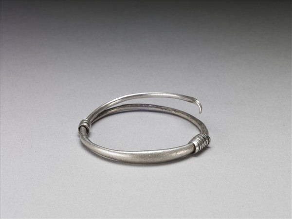 銀銅合金手鐲,整器由兩端較細的金屬條製作而成,中段略凸,外壁光素無紋。金屬條拗彎為圓,一端反折旋繞於器身,器身另又緊密繞纏的金屬片,可作為配戴時固定、調整環徑之用。