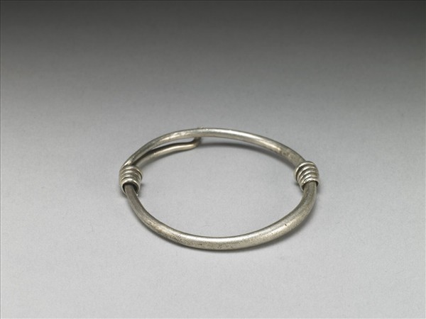 銀銅合金手鐲,整器由兩端較細的金屬條製作而成,外壁光素無紋。金屬條拗彎為圓,一端反折旋繞於器身,器身另又緊密繞纏的金屬片,可作為配戴時固定、調整環徑之用。