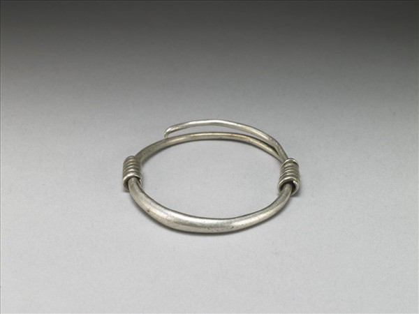 銀銅合金手鐲,整器由兩端較細的金屬條製作而成,外壁光素無紋。金屬條拗彎為圓,一端反折旋繞於器身,器身另又緊密繞纏的金屬片,可作為配戴時固定、調整環徑之用。