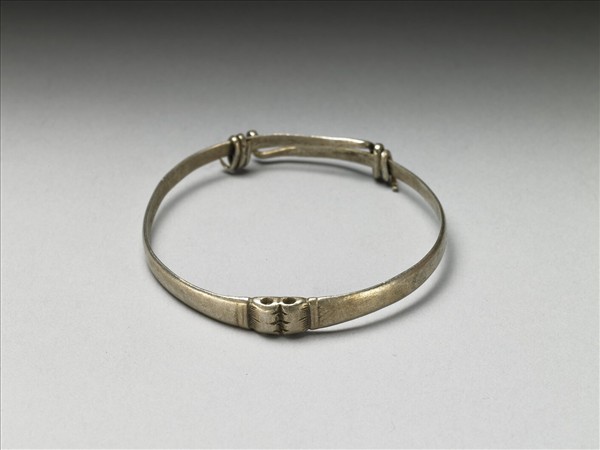 銀銅合金項圈,整器由兩端較細的金屬片製作而成,中段部分有如雙駝峰凸起,上刻陰線紋為飾。金屬片拗彎為圓,兩端分別反折旋繞於器身,作為配戴時固定、調整環徑之用。