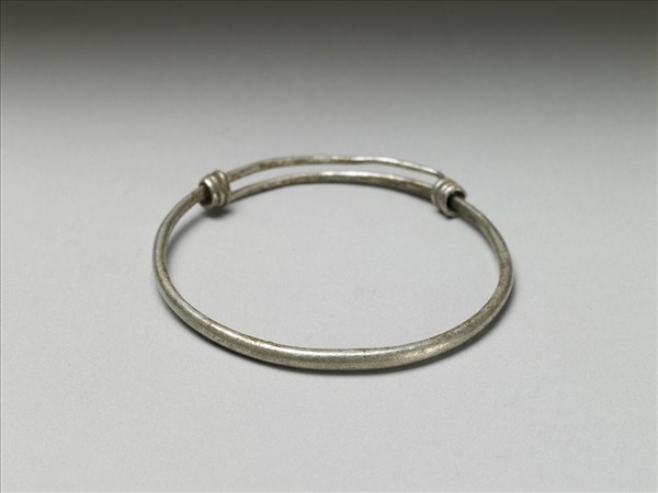 銀銅合金手鐲,整器由中段部分略扁、兩端較細的金屬條製作而成。金屬條拗彎為環形,兩端分別反折旋繞於器身,作為配戴時固定、調整環徑之用。