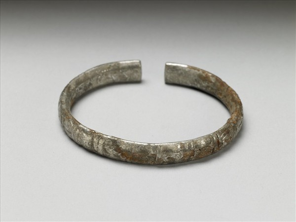銀銅合金手鐲,整器由金屬片彎拗為環形而成器。器有缺口,表面磨損,但仍可看出直線紋將表面分隔的痕跡。