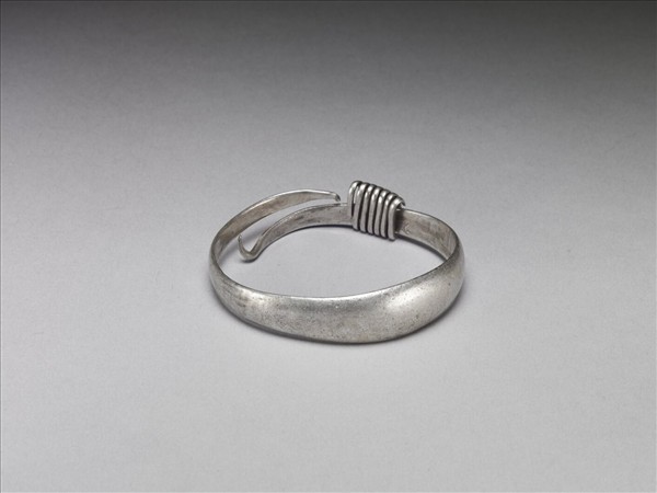 銀銅合金手鐲,整器由金屬片彎折為環形而成器,中段較寬,兩端呈尖細狀收尾,器外壁光素無紋,緊密纏繞一段金屬條,用以固定、調整環徑的大小。
