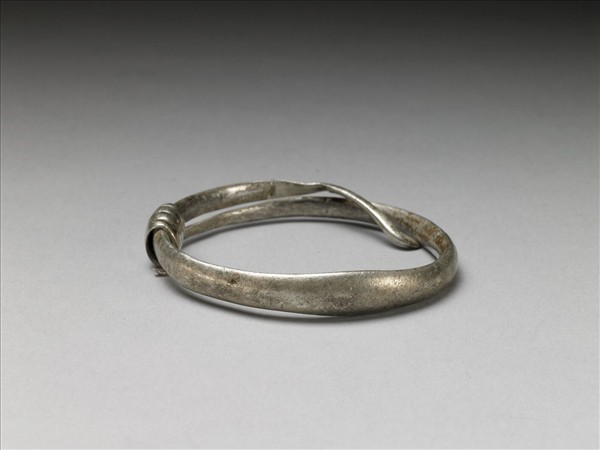 銀銅合金手鐲,整器由金屬片製作而成。中段較寬,兩端急收,金屬片彎折為環形而成器。器外壁光素無紋,緊密纏繞一段金屬條,用以固定、調整環徑的大小。