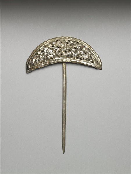 銀銅合金髮簪,素挺尖首,簪面作半月形,飾鏤空折枝梅花及喜鵲,意寓「喜上眉梢」,周圍一圈波浪紋邊飾。