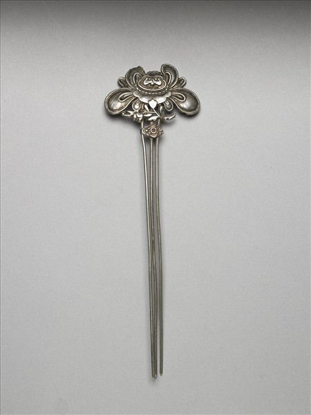 銀銅合金髮釵,挺三股,皆尖首光素,近釵面處以花形金屬飾片並連。釵面作一盛開折枝花,枝小花大,主從分明,且花瓣邊緣線較顯明。花瓣面略外弧,面上刻細密陰線,其邊廓明顯則使得簪面花朵較具裝飾性。