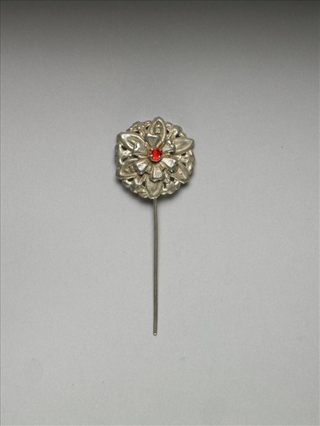 銀銅合金髮簪,素圓挺,簪面作花形,以三種花瓣由大而小、依次上疊而成形,花心部分鑲紅色玻璃。