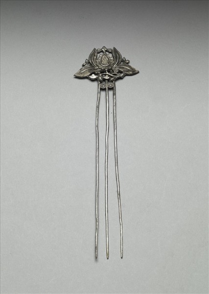 銀銅合金髮釵,素挺三股,近釵面處以花形小飾片並連。釵面作一側面盛開番蓮花兩瓣挺立,兩瓣水平覆垂,花瓣邊廓均刻飾細密短陰線紋,增添花朵的裝飾性效果。