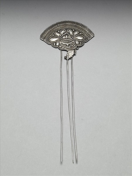 銀銅合金髮釵,素挺三股,原以蝙蝠飾片並連,但該飾片已損。釵面扇形,長弧邊刻飾細密尖首直棱紋圓點,面上以盛開花一朵為飾。