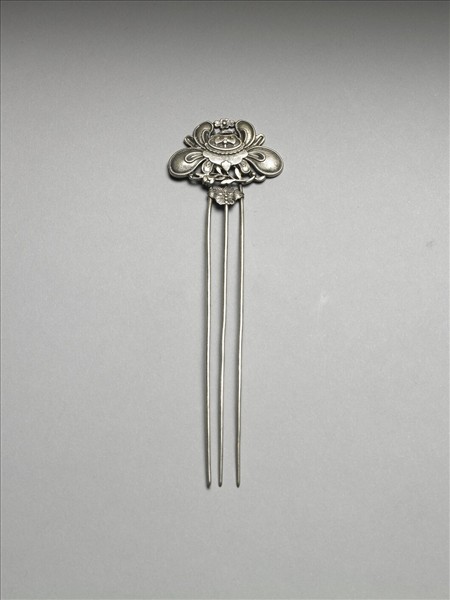 銀銅合金髮釵,挺三股,皆尖首光素,近釵面處以蝴蝶金屬飾片並連。釵面作一盛開折枝花,枝小花大,主從分明,且花瓣邊緣線較顯明。花瓣面略外弧,面上刻細密陰線,其邊廓明顯則使得釵面花朵較具裝飾性。
