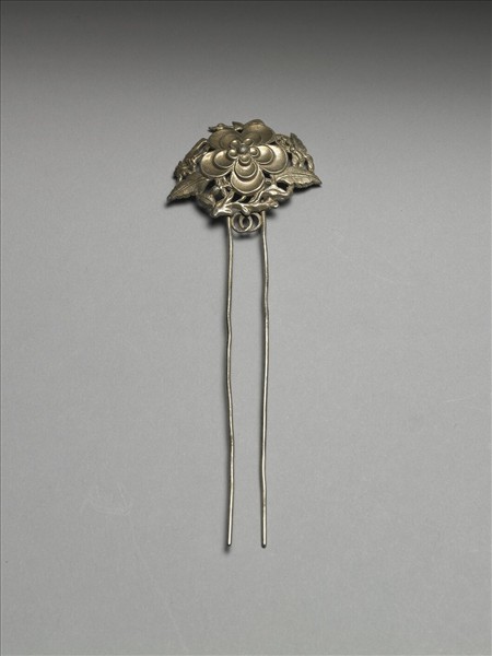 銀銅合金髮釵,素挺雙股,皆尖首光素,近釵面處以雙金屬環並連。釵面作一盛開折枝五瓣花,枝小花大,主從分明,花葉間尚見飾蝴蝶與鳥紋。