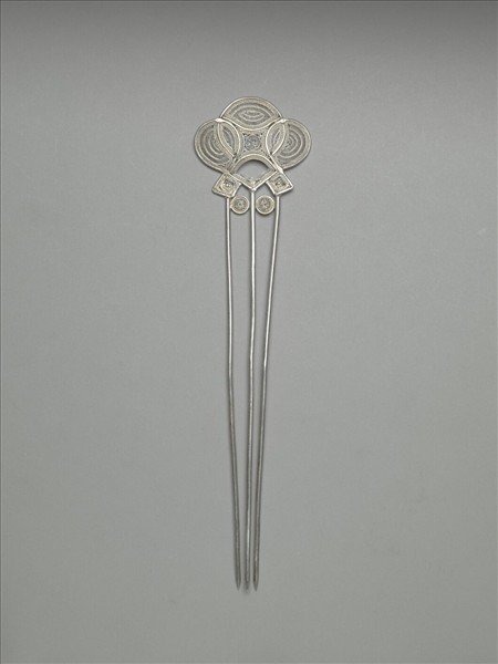銀銅合金髮釵,素挺三股。釵面作數個幾何形交疊相錯之形,以一大圓為主體,圓左右接疊一小圓,下方接一弧三角,弧三角兩側方形,除此方形內以朵花為飾外,,其餘表面飾以細密曲線紋。