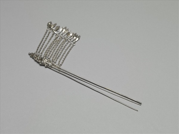 步搖,銀銅合金,簪首飾盆花、蝴蝶;背面以銀絲繞成圈環,連綴銀鍊流蘇,流蘇尾端綴有八面體墜角,簪首下方接三根圓素挺。