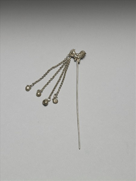 步搖,銀銅合金,飾敲花公雞簪首,公雞胸前有一環,連綴銀鍊流蘇,下綴球形墜角,圓素挺。