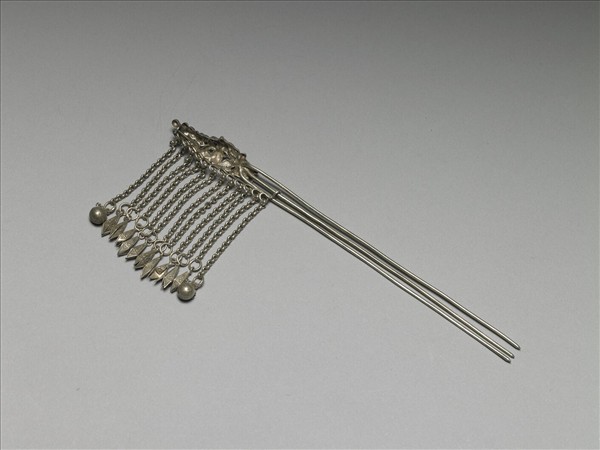 步搖,銀銅合金,簪首飾盆花、蝴蝶;背面以銀絲繞成圈環,連綴銀鍊流蘇,流蘇尾端綴有鈴鐺及八面體墜角,簪首下方接三根圓素挺。