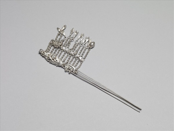 步搖,銀銅合金,簪首飾盆花、蝴蝶,下方有一文人與童子乘船的圖樣;背面以銀絲繞成圈環,連綴銀鍊流蘇,每條流蘇中間均飾有圓形菊花紋銀片,流蘇尾端綴有鈴鐺及八面體墜角,簪首下方接三根圓素挺。