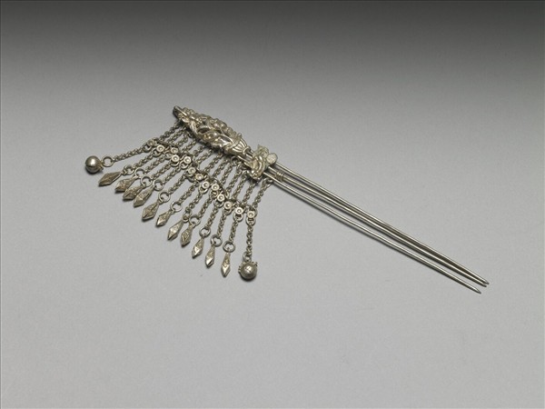 步搖,銀銅合金,簪首飾盆花、蝴蝶,下方飾一人物;背面以銀絲繞成圈環,連綴銀鍊流蘇,流蘇尾端綴有鈴鐺及八面體墜角,簪首下方接三根圓素挺。