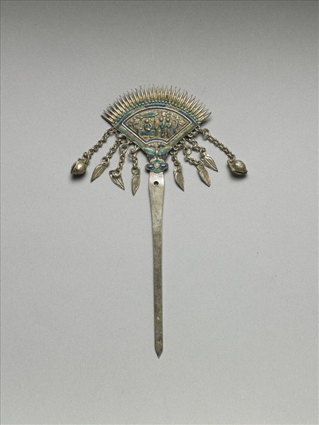 步搖,銀銅合金,扇形簪首以敲花為飾,內填琺瑯,中央開光飾人物,一人坐在屋中,二人在園中對談,上飾圓點紋,上緣加飾一排錐形邊飾,下飾一蝴蝶及一雲紋,兩側飾花邊,綴有流蘇,帶球形、葉形墜角。扁平素挺,接近簪首處較寬。