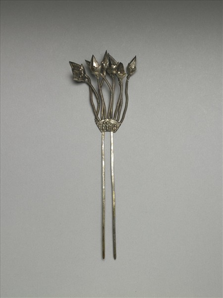 髮釵,銀銅合金,釵首由九朵花苞組成,每朵花以彈簧為花莖,與釵挺連接處飾扇形銀片,上以敲花飾庭園人物,下接二扁平素挺。