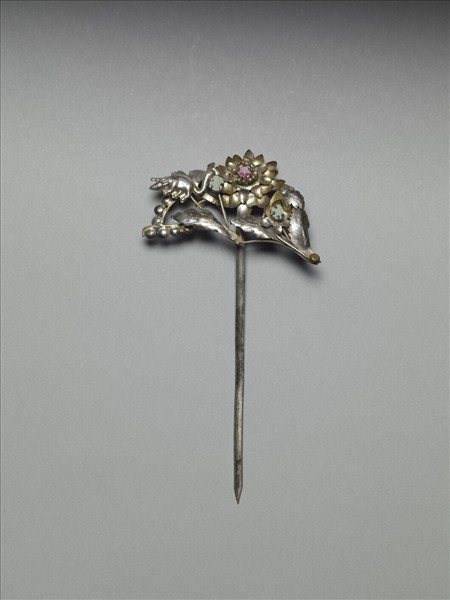 髮簪,以敲花銀銅合金片組合成折枝牡丹花簪首,花心嵌玻璃,左方有一隻松鼠攀在藤上,素圓挺。