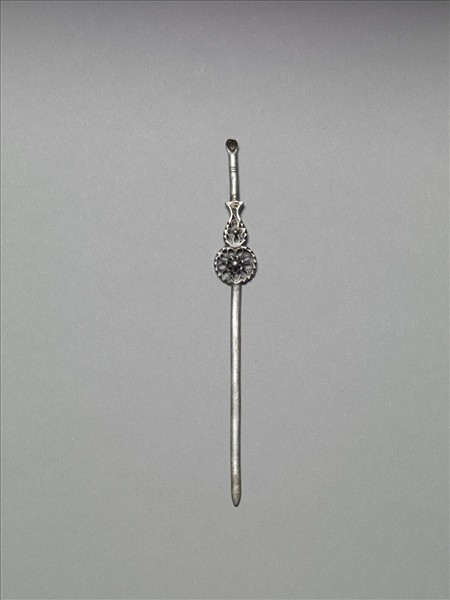 耳挖簪,簪首頂端有一勺狀耳挖,下陰刻三道弦紋,接葫蘆型鏤空花朵紋簪首,下接扁圓形素挺。