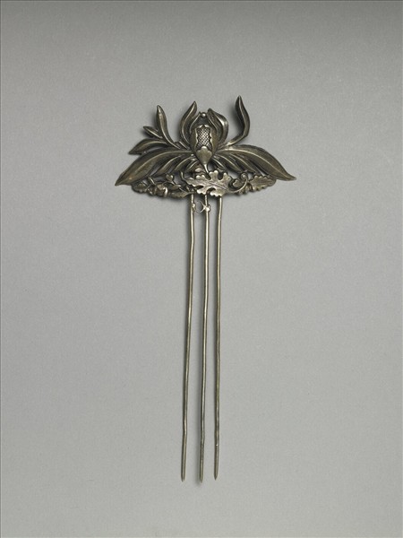 髮釵,以敲花銅銀合金片作成折枝番蓮花釵首,三根素圓挺。