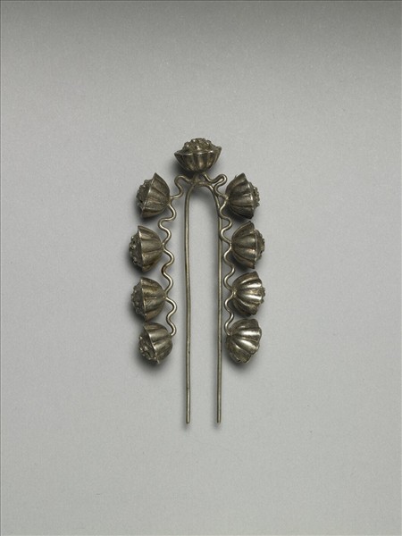 髮釵,銅銀合金,九朵蓮蓬接於波浪狀的銀絲上作為釵首,銀絲彎成U字形挺。