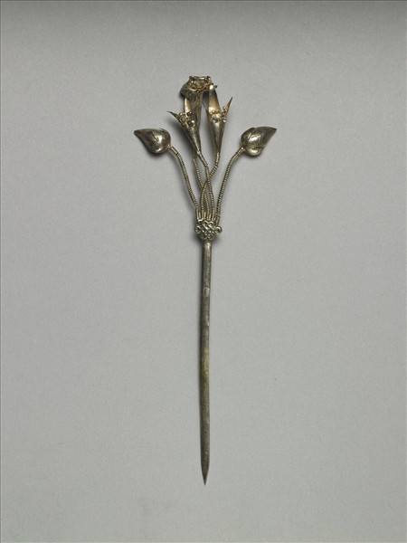 髮簪,銅銀合金,簪首由兩朵蓮苞及百合組成,每朵花以彈簧為花莖,與簪挺連接處飾盤長紋銀片,下接扁平素挺。