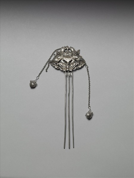 步搖,銀銅合金,簪首以敲花飾蓮花紋及蝴蝶紋,上方頂端及兩側各綴一銀鍊流蘇,下接桃形墜角,左側銀鍊已斷,三根素圓鋌,鋌間近簪首處有一對雙圈裝飾。