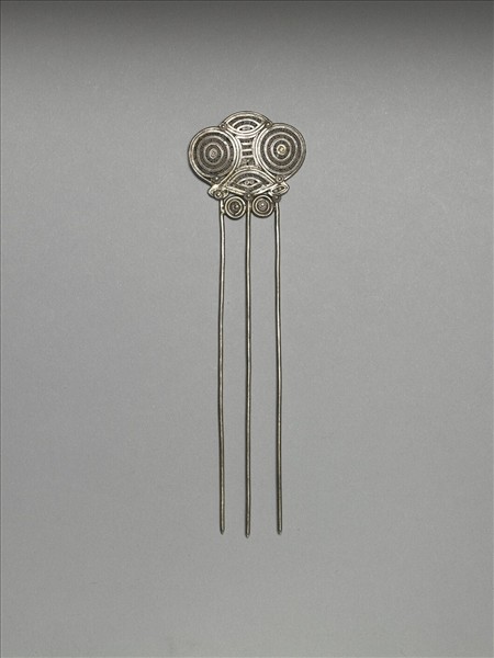 髮釵,銀銅合金,釵首由圓形及扇形組成,纍絲為飾,具三根素圓鋌。