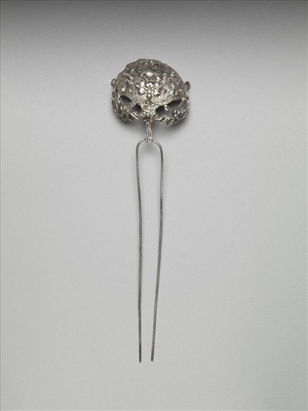 髮釵,銀銅合金,半球形簪首,飾敲花兔子、花卉,底襯點紋錦地紋。簪挺為U形長銀條。
