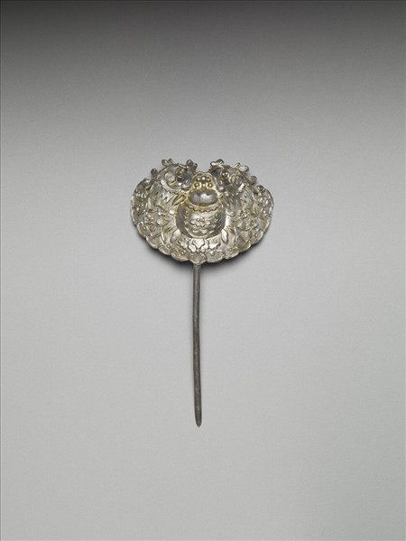 髮簪,銀銅合金,簪首作敲花蝙蝠,身上飾梅花紋,兩側飾一對團壽紋及古錢紋,有「喜福」、「福壽雙全」之意,素圓挺。