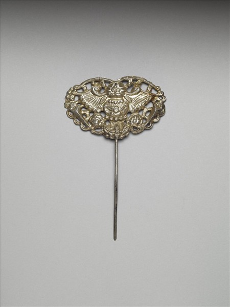 髮簪,銀銅合金,簪首作敲花蝙蝠,身上飾朵花紋,周圍作鏤空卷枝花卉紋,下方飾一對犀角紋,素圓挺。