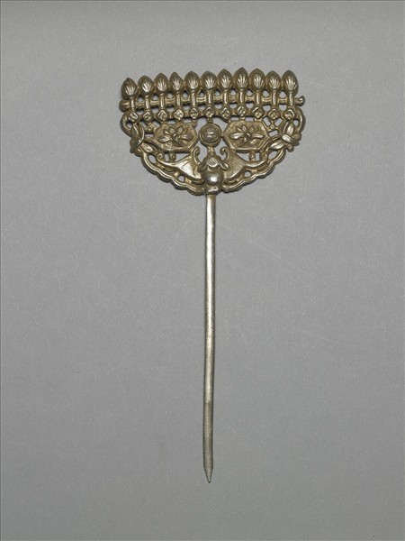 髮簪,銀銅合金,半圓形簪首,飾蝙蝠、蝴蝶、蓮花、朵花、團壽紋等紋飾,素圓挺。