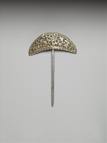 髮簪,銀銅合金,半圓形簪首,飾鏤空折枝梅花及喜鵲,意寓「喜上眉梢」,周圍一圈波浪紋邊飾,素圓挺。