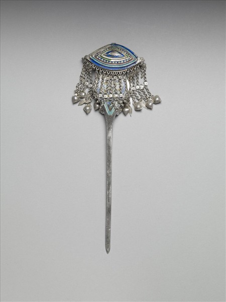 步搖,銀銅合金,簪首近眼形,以銀絲繞出多層條紋,各層做敲花直線紋或三角紋,中央貼飾蝴蝶紋,上方中央有一排對葉紋;片狀簪挺於上端呈眼形擴大處飾折枝花卉紋,圖案內填之琺瑯色料有剝落現象。簪首背面下方接有一排S形銀絲,垂掛鍊狀流蘇,中央有圓形銀片串連,下綴葉形及桃形墜角。簪挺上下兩側扁平細長。