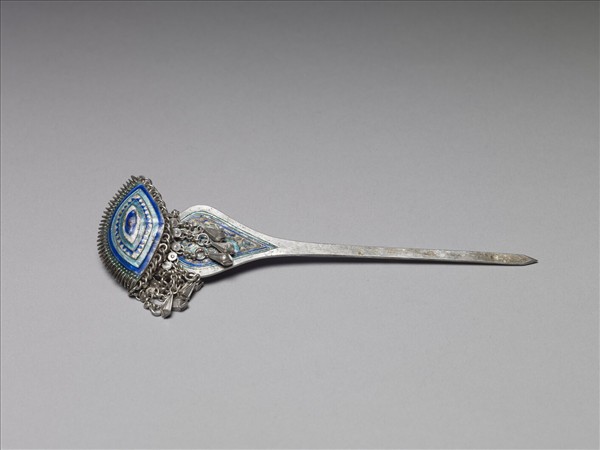 步搖,銀銅合金,簪首近眼形,以銀絲繞出多層條紋,各層做敲花直線紋或三角紋,中央貼飾蝴蝶紋,上緣飾一排葉形紋;片狀簪挺於上端呈眼形擴大處飾折枝花卉紋,圖案內填之琺瑯色料有剝落現象。簪首背面下方接有一排S形銀絲,垂掛鍊狀流蘇,中央有圓形銀片串連,下綴葉形及桃形墜角。簪挺上下兩側扁平細長。