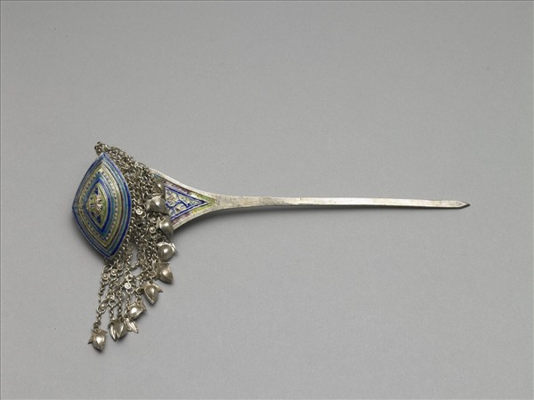 步搖,銀銅合金,簪首近眼形,以銀絲繞出多層條紋,各層做敲花直線紋或三角紋,中央貼飾蝴蝶紋,上方中央有一排對葉紋;片狀簪挺於上端呈眼形擴大處飾折枝花卉紋,圖案內填之琺瑯色料有剝落現象。簪首背面下方接有一排S形銀絲,垂掛鍊狀流蘇,中央有圓形銀片串連,下綴葉形及桃形墜角。簪挺上下兩側扁平細長。