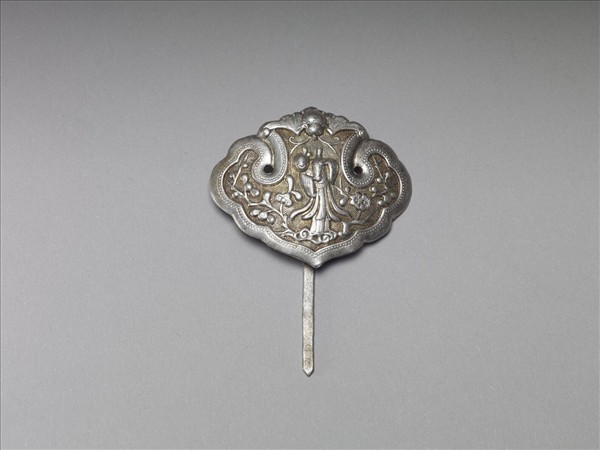 髮簪,銀銅合金,如意雲形簪首,以敲花為飾,上方為蝠紋,中央有一女子側身持瓶,兩旁飾折枝梅花,圖案隙地為圓點紋錦地。扁平素挺。