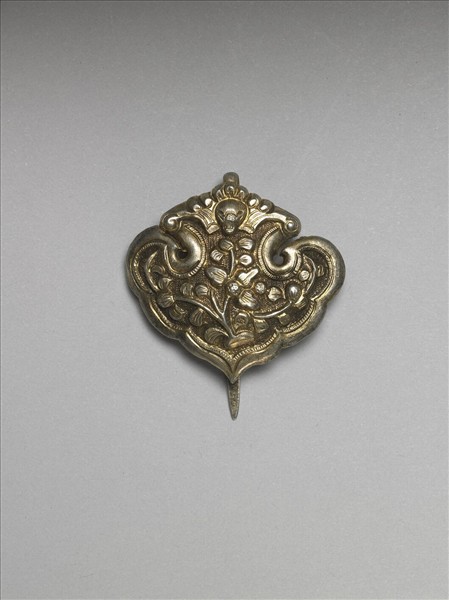 髮簪,銀銅合金,如意雲形簪首,以敲花為飾,上方為蝠紋,中央飾卷葉折枝花卉,圖案隙地為圓點紋錦地,邊緣鏨刻線紋邊飾。扁平素挺。