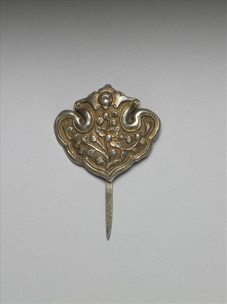 髮簪,銀銅合金,如意雲形簪首,以敲花為飾,上方為蝠紋,中央飾卷葉折枝花卉,圖案隙地為圓點紋錦地,邊緣鏨刻線紋邊飾。扁平素挺。