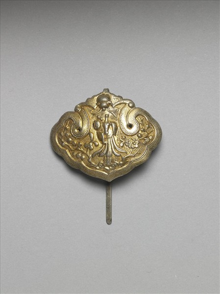 髮簪,銀銅合金,如意雲形簪首,以敲花為飾,上方為蝠紋,中央有一女子側腰持瓶,兩旁飾折枝梅花,圖案隙地為圓點紋錦地。扁平素挺。