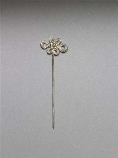 髮簪,銀銅合金,盤長紋簪首,中央有一梅花紋,整體裝飾點狀花紋。素圓挺。