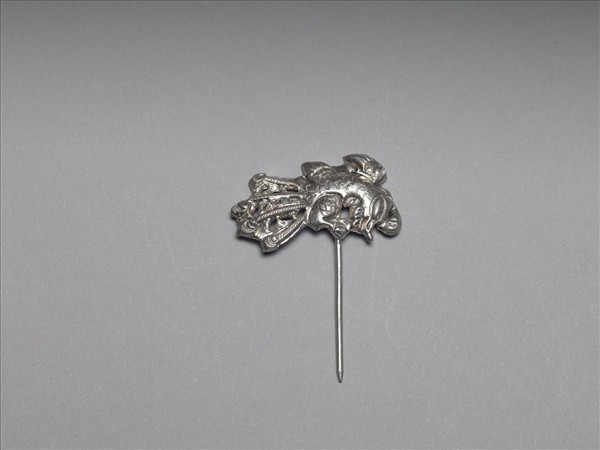 髮簪,以鏤空敲花銀銅合金片作鳥紋簪首,再以鏨刻刻劃五官翎羽等細部線條,素圓挺。