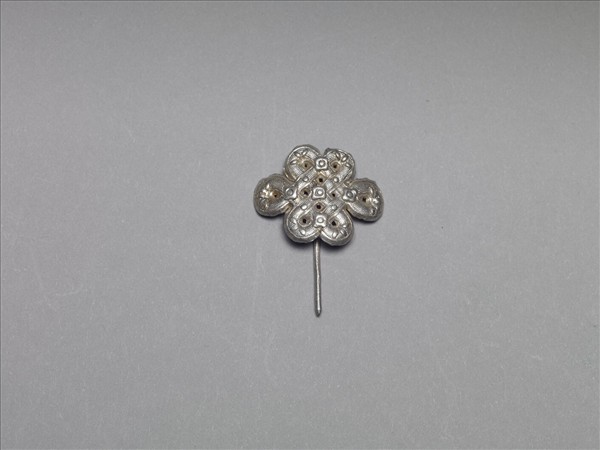 髮簪,銀銅合金,盤長紋簪首,中央及各線條交點處飾朵花紋及圓點紋,轉折處飾葉紋,全器襯圓點紋錦地。素圓挺。