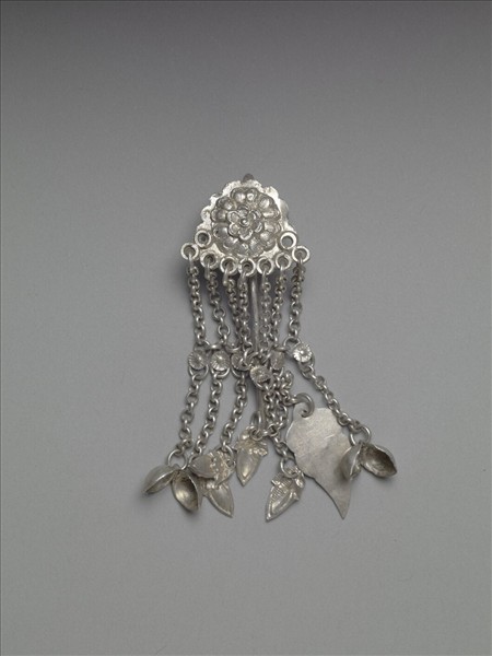 髮簪,以敲花銀銅合金片作朵花簪首,下綴銀鍊流蘇,中段裝飾圓形銀片,下接葉形與桃形墜角,素圓挺。