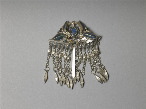 髮簪,以敲花銀銅合金片作番蓮花簪首,內填藍綠色琺瑯,部分脫落,下綴銀鍊流蘇,裝飾圓形銀片,下接八面體墜角,扁平素挺。