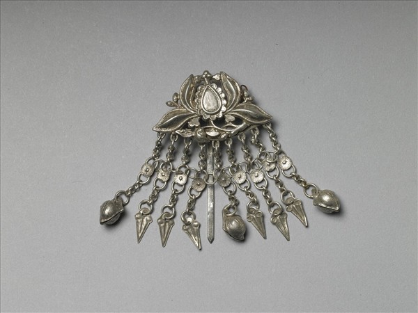 步搖,以敲花銀銅合金片作番蓮花簪首,下綴銀鍊流蘇,中段裝飾圓形銀片,下接桃形或葉形墜角,素光挺,扁平而短。
