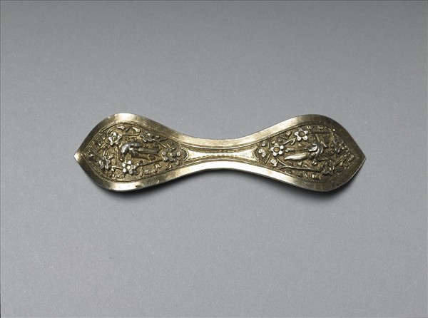 扁簪,銀銅合金,長形,中央較細,兩側鈍圓而尖首。正面兩側開光中飾圓點紋錦地敲花喜鵲、折枝梅花紋,有「喜上眉梢」之意。背面中央鏨刻楷體「寶盛」陰文款。